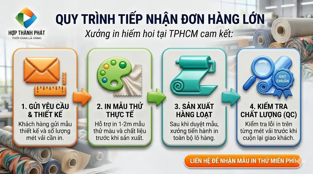 Bạn đang vận hành xưởng may quy mô lớn? Bạn cần đối tác gia công in vải cây hoặc in vải cuộn với sản lượng ổn định? In Vải Hợp Thành Phát tự hào là đơn vị tiên phong cung cấp giải pháp in công nghiệp hiện đại. Chúng tôi cam kết chất lượng đồng nhất trên từng mét vải.